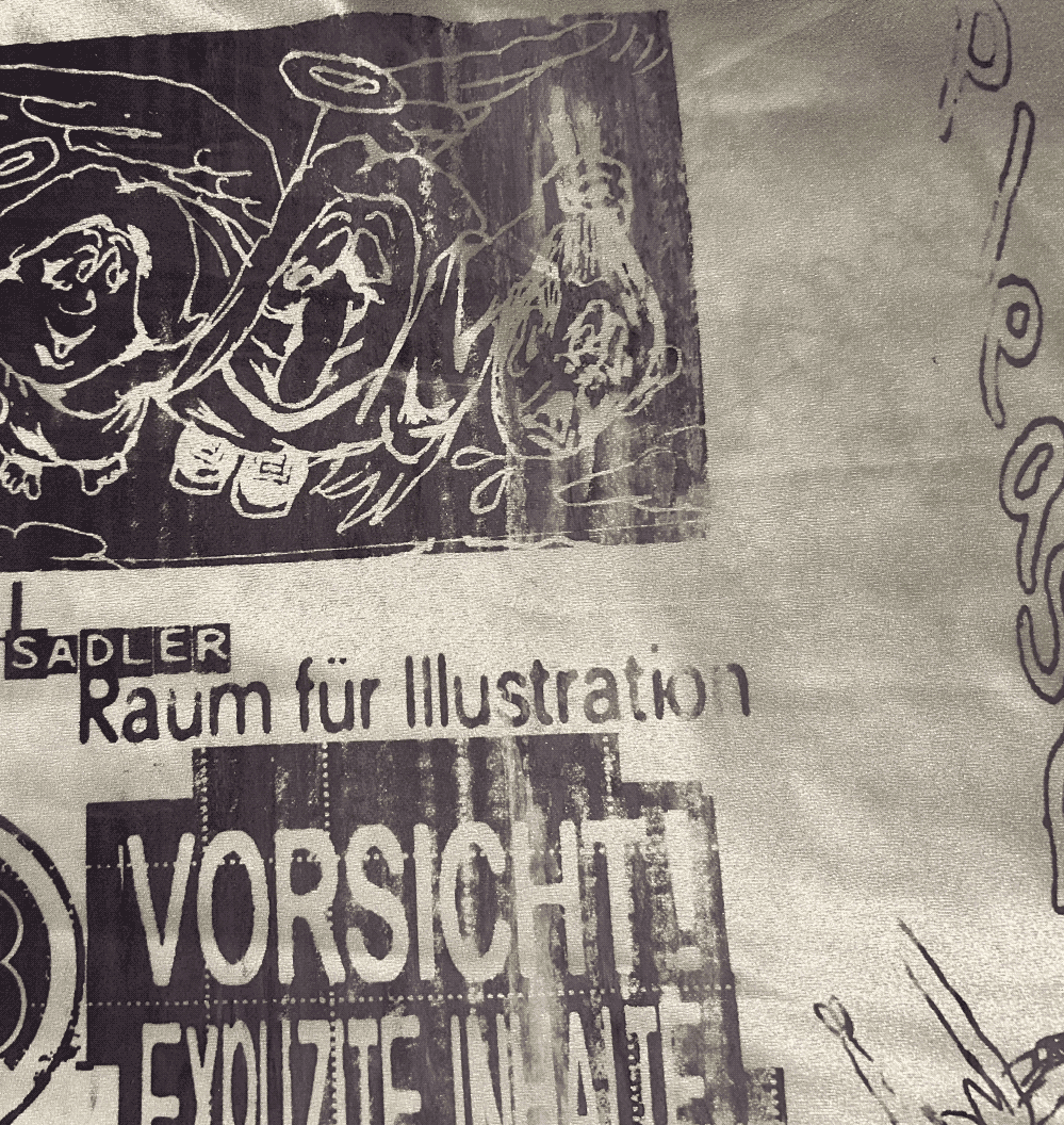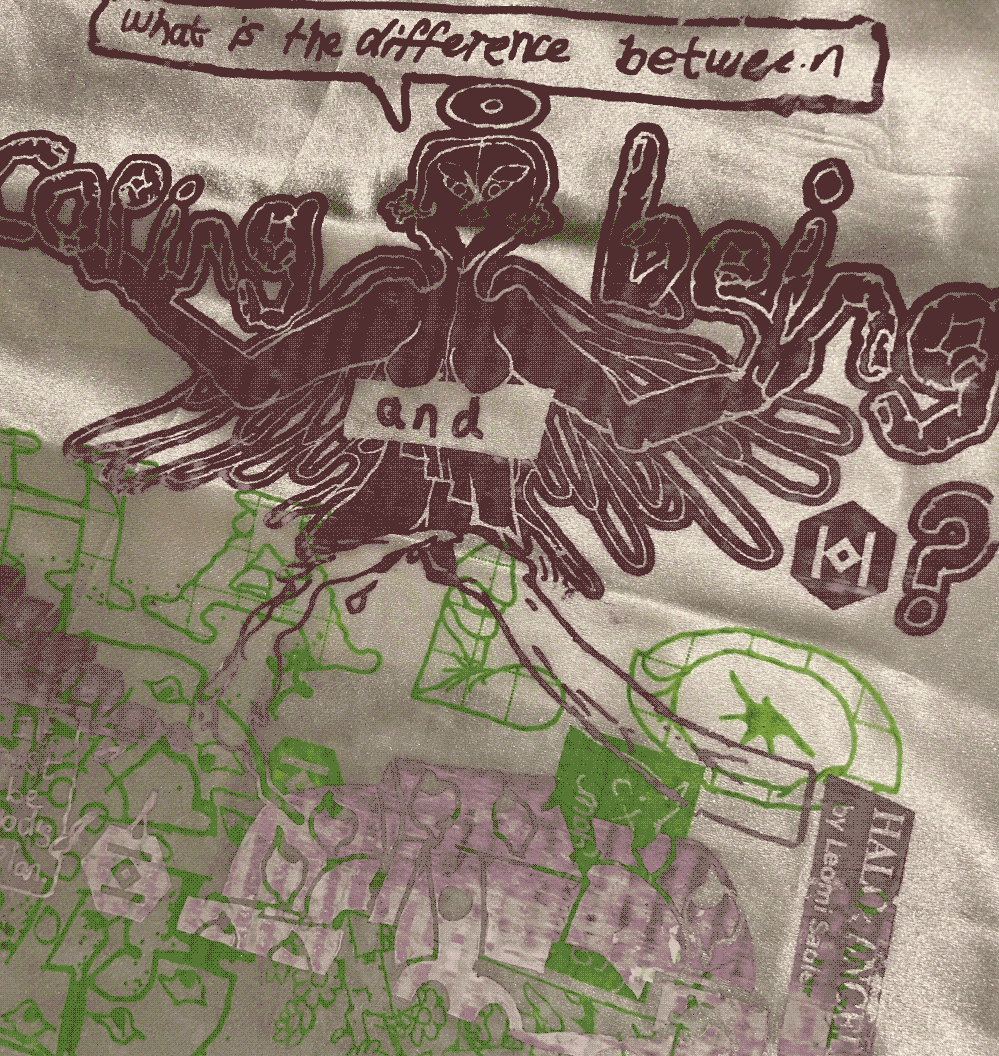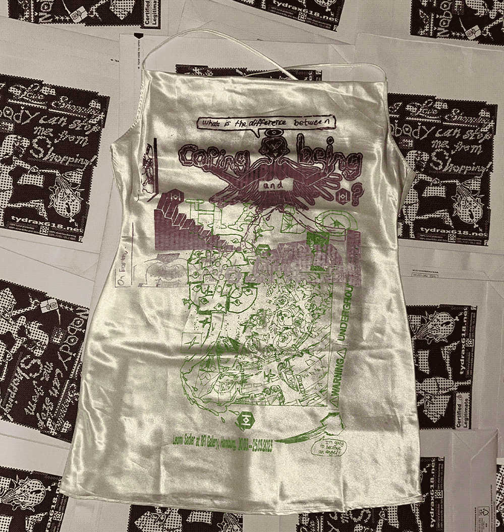 "Halo" at RFI Hamburg in 2023, these 3 little satin dresses are each silkscreened uniquely layered with messy angel graphics. Would you like to appear angelic?" (Sized according to their labels)